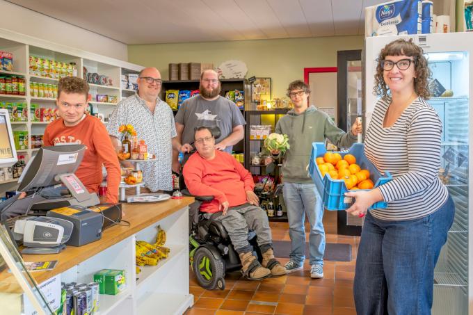 Emile, Koen, Christophe, Ewout, Jeno en Griet in de buurtwinkel van De Companie. "Mensen uit de omgeving komen hier graag omdat we nog tijd maken voor een praatje." (foto Joke Couvreur)